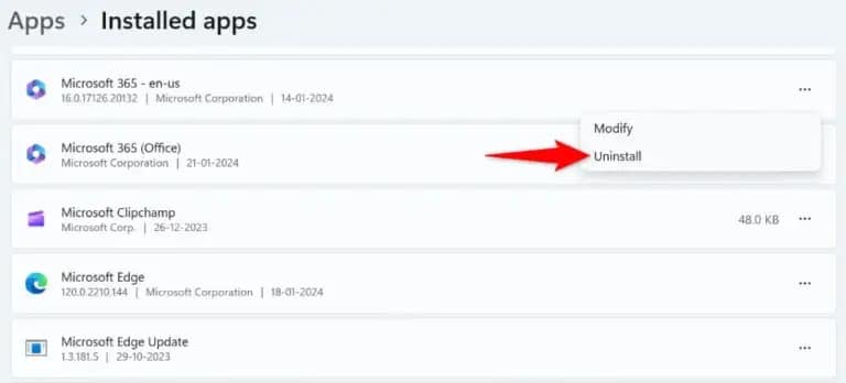- Find Microsoft Office, select the three dots next to the app, and choose Uninstall