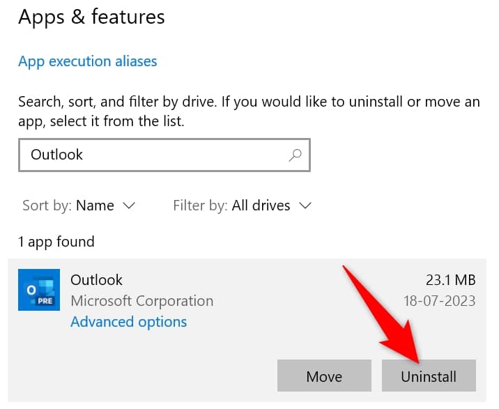 - Find Outlook, select the app, and choose Uninstall.