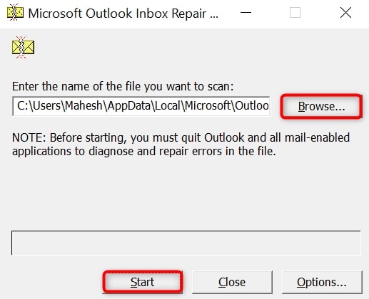 Steps: Close Outlook, open Scanpst.exe in the Outlook installation folder.