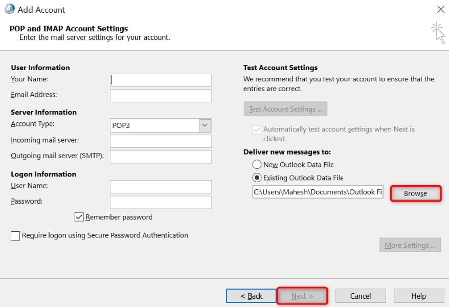 - Select Browse in the Deliver new messages to section and choose your Outlook data file.