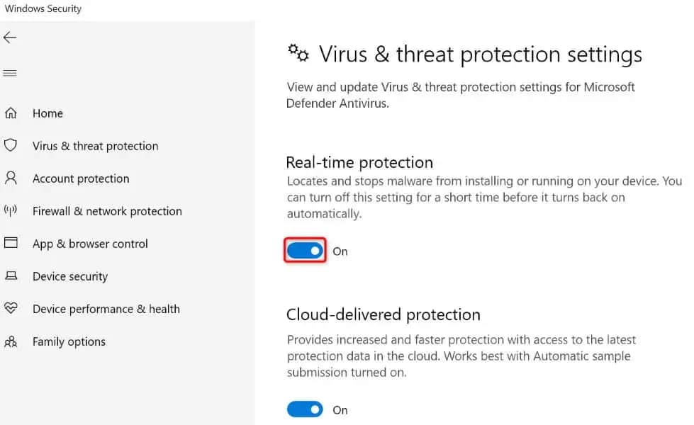 - Turn off the Real-time protection toggle.