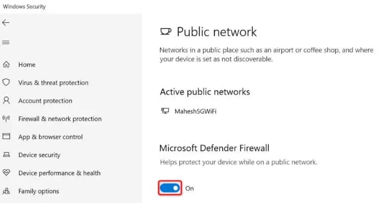 - Turn off the Microsoft Defender Firewall toggle.
