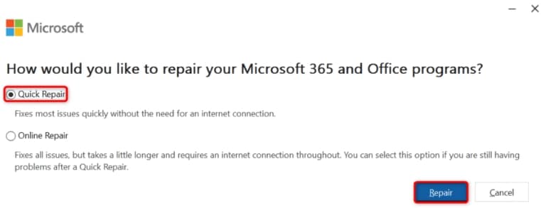 - Select Quick Repair and choose Repair in the open tool.